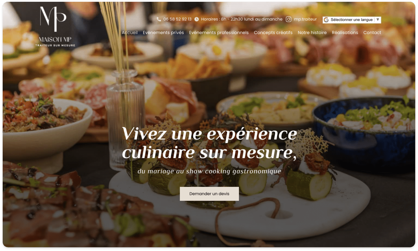 Nous avons conçu un site vitrine sur-mesure pour MP Traiteur, spécialiste des événements privés et professionnels à Nice, afin de refléter son univers gastronomique haut de